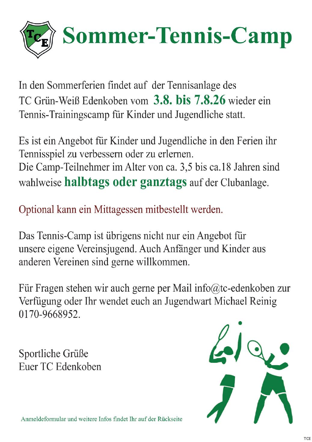 Das TCE Tennis-Trainingscamp für Kinder und Jugendliche findet in der letzten Woche der Sommerferien vom 3.8. bis 7.8.26, statt. Es ist ein Angebot in den Ferien sein Tennisspiel zu verbessern oder zu erlernen. Die Kinder und Jugendlichen im Alter von ca. 4-18 Jahren sind wahlweise halbtags bzw. den ganzen Tag auf der Tennisanlage.
