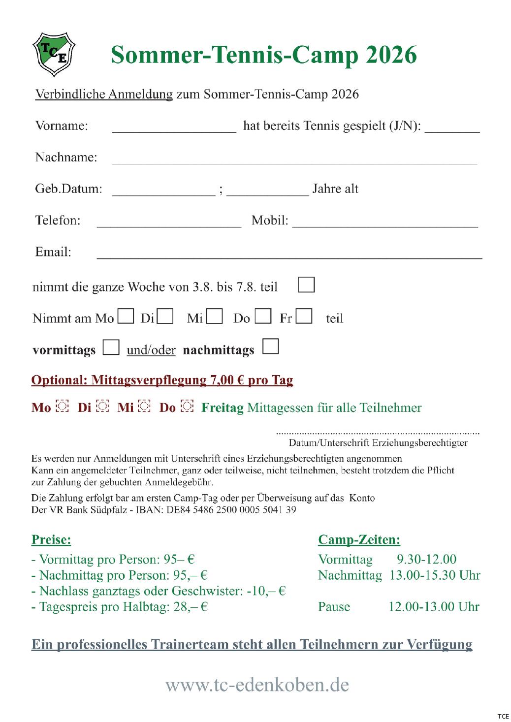 Das TCE Tennis-Trainingscamp für Kinder und Jugendliche findet in der letzten Woche der Sommerferien vom 3.8. bis 7.8.26, statt. Es ist ein Angebot in den Ferien sein Tennisspiel zu verbessern oder zu erlernen. Die Kinder und Jugendlichen im Alter von ca. 4-18 Jahren sind wahlweise halbtags bzw. den ganzen Tag auf der Tennisanlage.